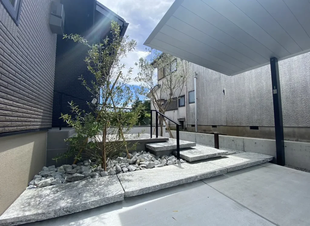 土地の高低差で建物が浮いて見えたり、逆に埋もれて見えたりするのはもったいない。門柱・階段・植栽の配置で建物との“重心バランス”を整えることで、美しい外構が完成します。